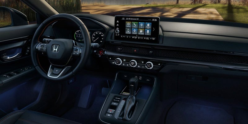 Available features include wireless smartphone syncing, a Wi-Fi hotspot, navigation, wireless charging, and a 12-speaker Bose premium audio system. The CR-V Hybrid offers 39.3 cubic feet of cargo space behind the rear seats, expanding to 76.5 cubic feet, with a passenger volume of 103.5 cubic feet.